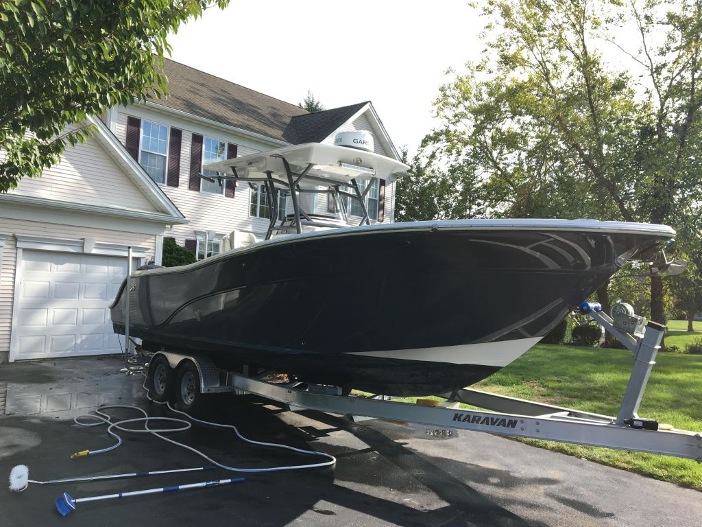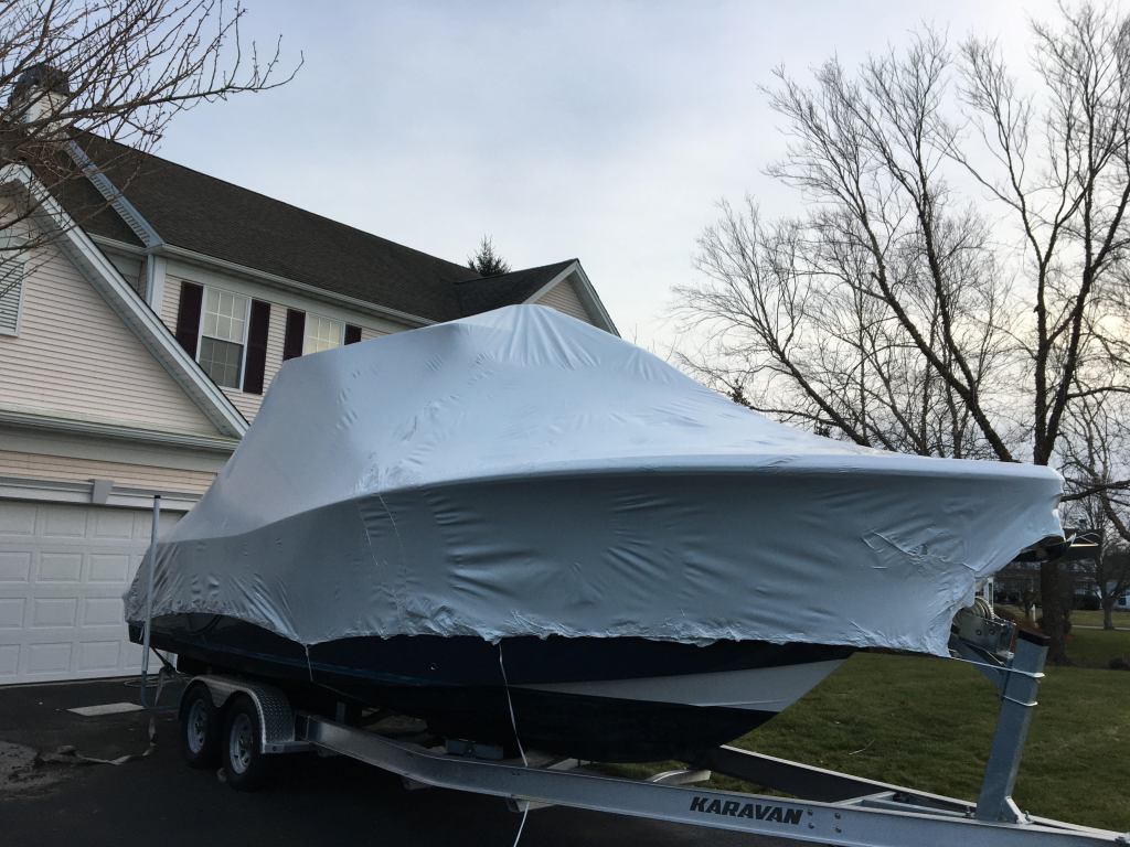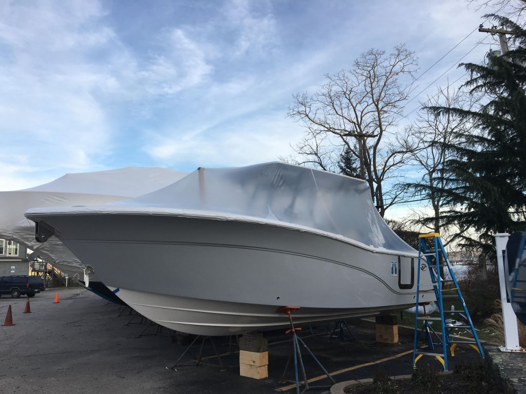 A slightly older but no less beautiful boat, this Sea Fox is nearly identical to my previous project though the hull required protection for upcoming transportation. Here you can see the traditional white shrink wrap and banding scheme used to provide full protection from the winter elements.
